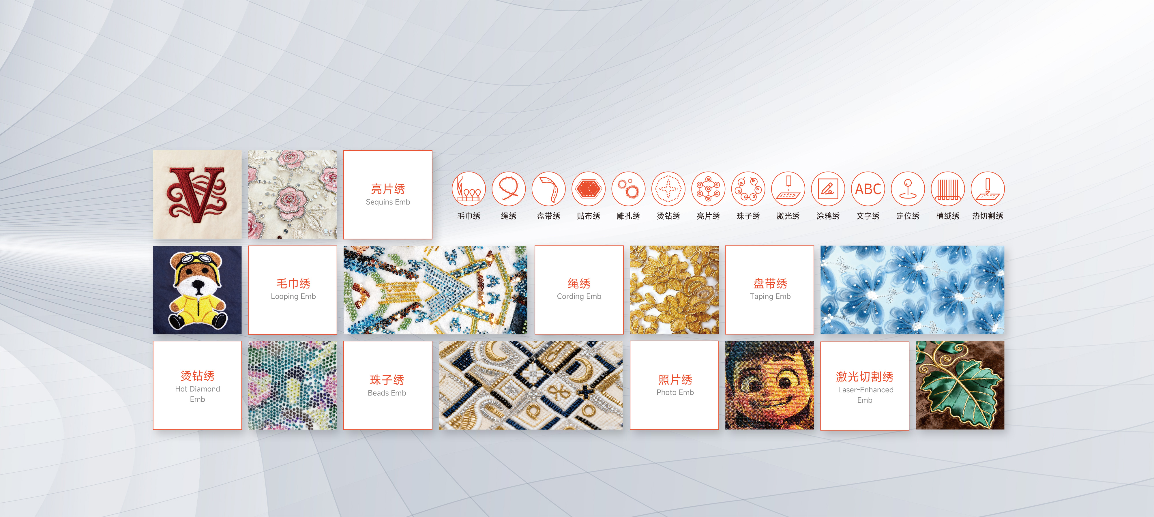 支持毛巾繡、鏈?zhǔn)嚼C及其與平繡混合繡