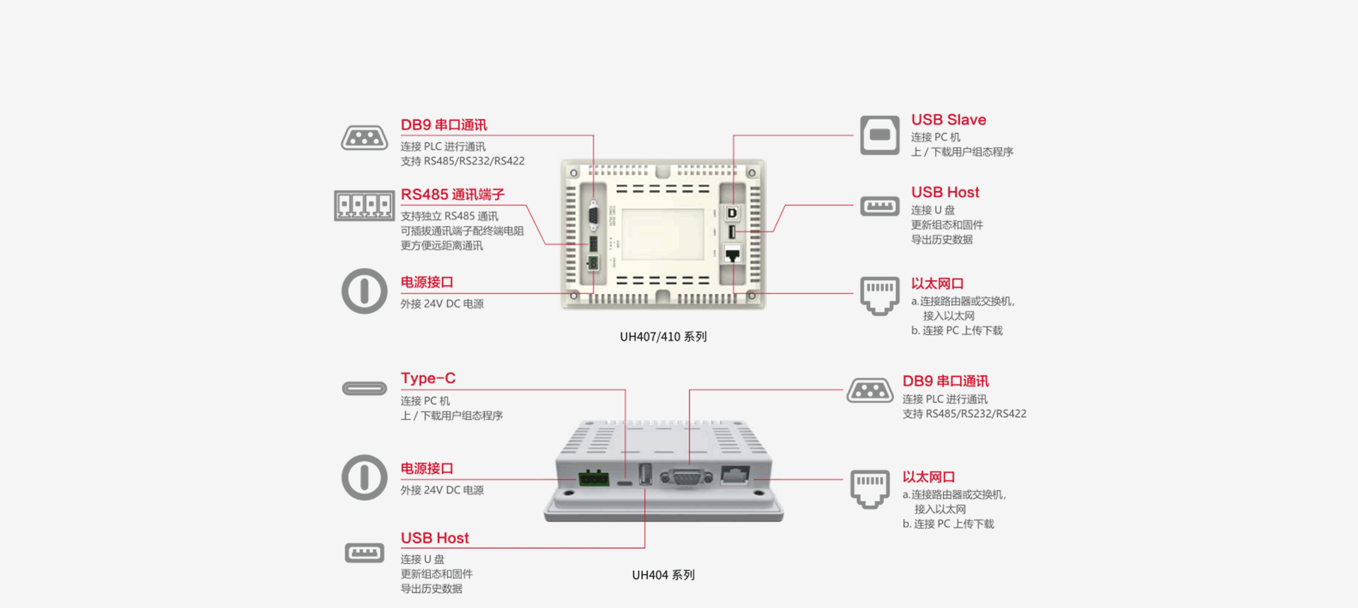 | UH 404E | 4.3"TFT | 480×272 | USB2.0×1,Type A(USB1),支持U盤更新固件、組態(tài)和存儲數(shù)據(jù) | Type C,支持供電、程序上下載 | COM1:RS485 COM2:RS232 | 10M/100 M自適應(yīng) | 138×101×32mm | |